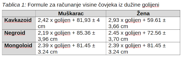 Tablica 1: Formule za računanje visine čovjeka iz dužine golijeni