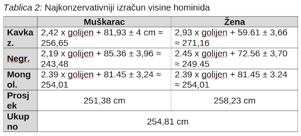 Tablica 2: Najkonzervativniji izračun visine hominida