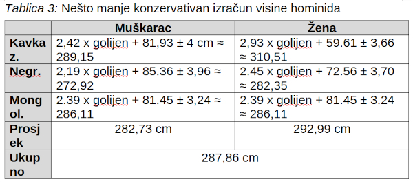Tablica 3: Nešto manje konzervativan izračun visine hominida
