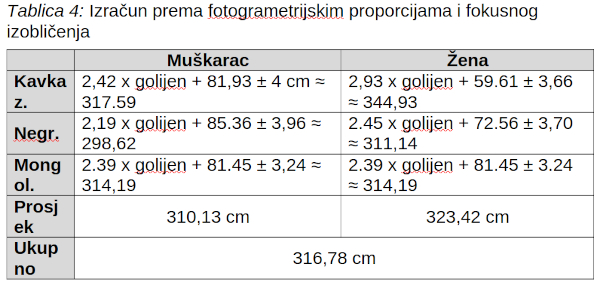 Tablica 4: Izračun prema fotogrametrijskim proporcijama i fokusnog izobličenja