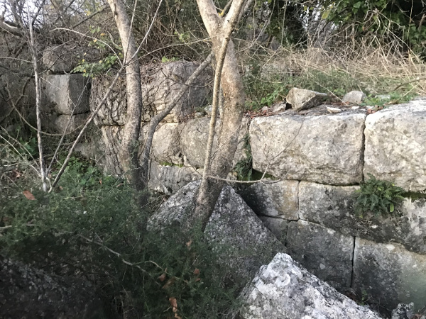 Obrasle vanjske zidine gradine Nadin - po svjedočanstvima mještana mnogi su blokovi našli mjesto u zidovima privatnih kuća