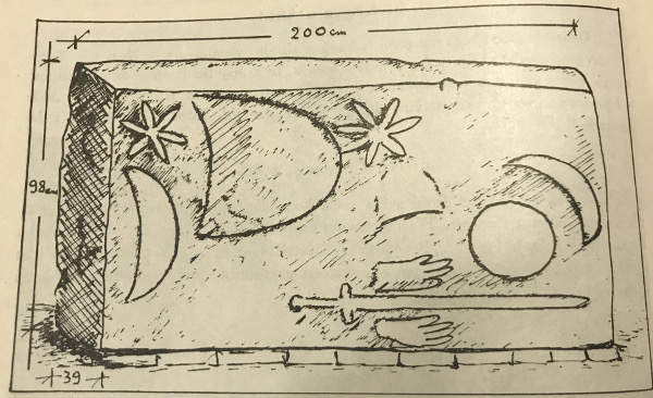 Stećak iz Plaškog na crtežu Ante Škobalja nastao prigodom posjete lapidariju Povijesnog muzeja Hrvatske (Izvor: Ante Škobalj ”Obredne gomile ...”, 1970.)