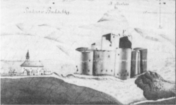 Crtež utvrde Budački i crkve Sveti Mihajlo i Gavrilo (na položaju srednjovjekovne crkve Sveti Mihovil) vojnog inženjera J. A. Schillingera iz 1746. godine (Izvor: Milan Kruhek "Graditeljska baština karlovačkog Pokuplja”, 1993.)