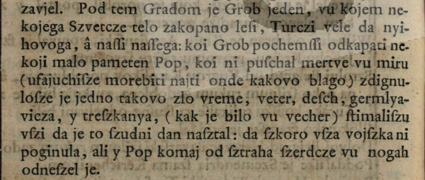 U bilješci koju je uvrstio u 1689. godinu, kada je Lika oslobođena od turske vlasti, povjesničar ističe: "Pod tem Gradom (Udbinom, nap. pis.) je Grob jeden, vu kojem nekojega Szveccze ćelo zakopano lesi, Turczi vele da nyihovoga (* 4), a nassi nassega: koi Grob pochemssi odkapati nekoji malo pameten Pop, koi ni puschal mertve vu miru (ufajuchisze morebiti najti onde kakovo blago) zdignulosze je jedno takovo zlo vreme, veter, desch, germlyavieza, i treszkanya, (kak je bilo vu vecher) stimaliszu vszi da je to szudni dan nasztal: da szkoro vsza vojszka ni poginula, ali y Pop komaj od sztraha szerdcze vu nogah odneszel je.".