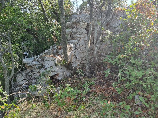 Spustivši se preko stijene u podnožje ispod utvrde na sjevernoj strani krenuli smo zapuštenom starom stazom uz suhozid prema sjeveru. Cilj nam je bila lokacija udaljena oko 250 metara koju sam spomenuo na početku, a koja ima tlocrtne osobine starinske gradnje. Nakon nekih pola sata hodanja po suhozidima nekadašnjih maslinika i probijanja kroz šikaru dospjeli smo do strmih stijena na našem cilju. Nismo pronašli nikakve tragove gradnje ljudskom rukom niti išta što bi nas navelo na zaključak da su ljudi ovdje ikada prije boravili. Zanimljivo je kako je priroda postigla takav učinak i rasporedila stijene i kamenje na način da gledano iz visine odaju dojam ljudske građevine.