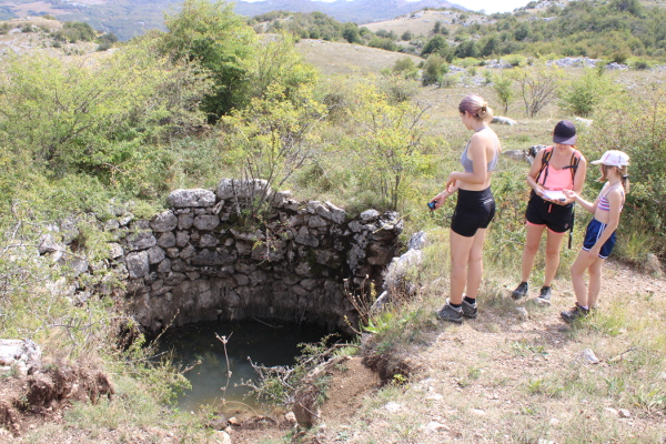 Martina Majetić bilježi izmjeru promjera grla prvoga bunara u gornjem redu skupine bunara Zakope u velebitskoj udolini Vučjak (Foto: Goran Majetić)