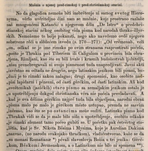 Na str. 37 spomenute knjige navodi se djelo "De Istro" Matije Petra Katančića (1750-1825.). Katančić u tom djelu tvrdi da se još u antičko doba koristilo staro pismo koje je iako potiskivano "ne i sasvim iščezlo". (Izvor: Google (books.google.hr))