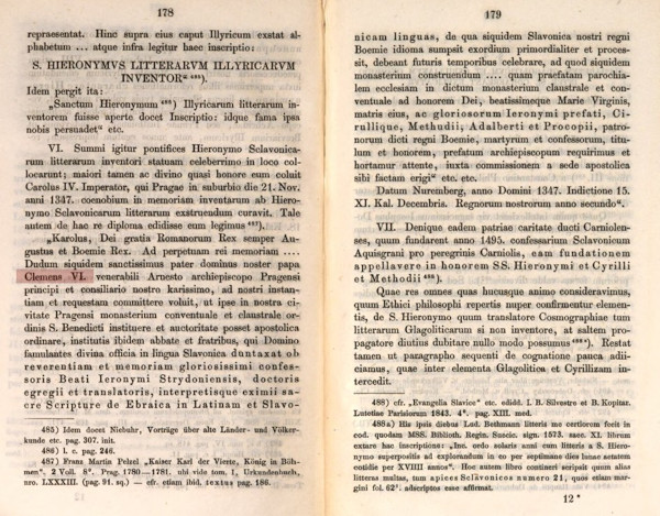 "Za sv. Jeronima, autora glagoljaške književnosti, prvo smo vidjeli kako se bore sami slavenski narodi, a zatim i dokaze knjiga, koje smo prenijeli - iz riječi Nicolausa Arbensisa proizlazi da je slavenska verzija svetih kodeksa postojala među Slavenima možda već u sedmom stoljeću, a to pokazuje i Codex Clotianus (Kločev glagoljaš) koji je označen njegovim autoritetom (sv. Jeronima) - tako da se narodna predaja Slavena ne može svesti ni na koga drugoga osim na sv. Jeronima. Sada iznosimo i druge dokaze pomoću kojih možemo inzistirati na daljoj argumentaciji. Dapače, poslanice pape Inocenta IV, Klementa VI., Pavla II., Urbana VIII., Klementa XI., Inocenta X., Benedikta XIII. i konačno Benedikta XIV. zabranjuju svaku sumnju o sv. Jeronimu, tvorcu slavonske pismenosti. Stoga se ne čini nepravednim, ili nepotrebnim za stvar, dodati ovdje one odlomke poslanica, koji imaju malo veći autoritet."