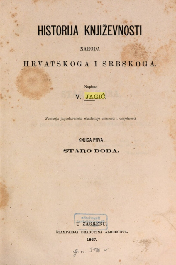 Naslovnica knjige ”Historija književnosti naroda hrvatskoga i srbskoga” u kojoj Jagić izražava neslaganje s ćirilometodskom teorijom. (Izvor: Internet Archive (archive.org))
