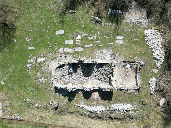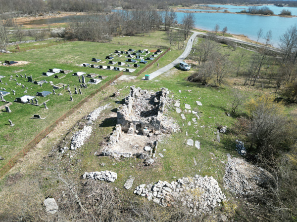 Zračni snimak Crkvine u Štikadi sa zapadne strane; lijepo se vide sjenica (lopica) hrama i hramska lađa, gomile kamenja prikupljene raščišćavanjem dijela urušenih zidova hrama, kao i većina okolnih stećaka; stećak s polukružnim čelom nazire se donjem lijevom kutu (Foto: Goran Koprek)